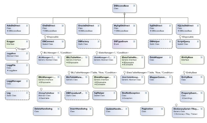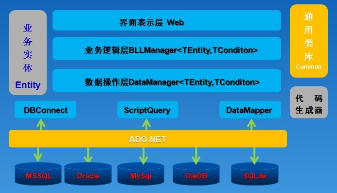 DataManager<TEntity,TConditon>----数据类的封装,通过使用泛型技术对数据层进行了抽象,封装了常用的CRUD方法,并提供了在CUD操作的事件,便于业务逻辑操作
