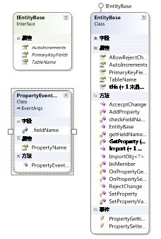 该实体有IEntityBase接口和EntityBase基类组成,接口定义了实体映射表的基本信息,表名、主键、自增型字段,EntityBase实现了该接口,包含了字段属性的设置、获取及相关属性的事件。